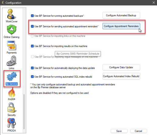 - Tick Use BP Service for sending automated appointment reminders and click Configure Appointment Reminders.