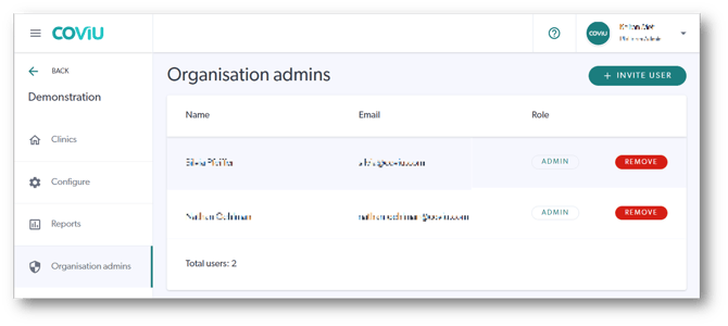 - From this view, you can invite a new administrator to join that specific Organisation or, remove existing administrators.