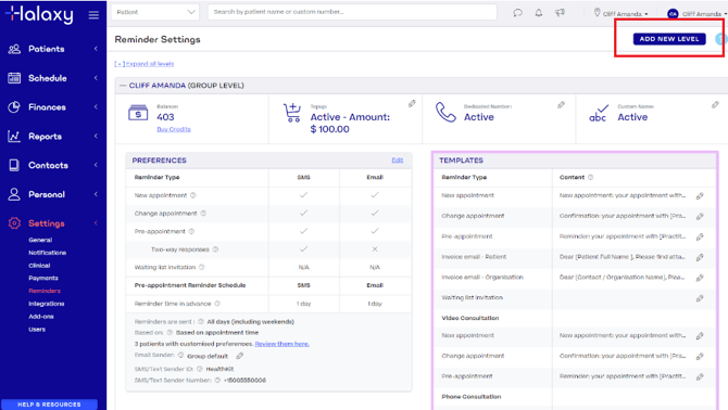 Note: If you wish to configure reminders for an individual practitioner instead, click Add New Level in the top right corner and select the practitioner.