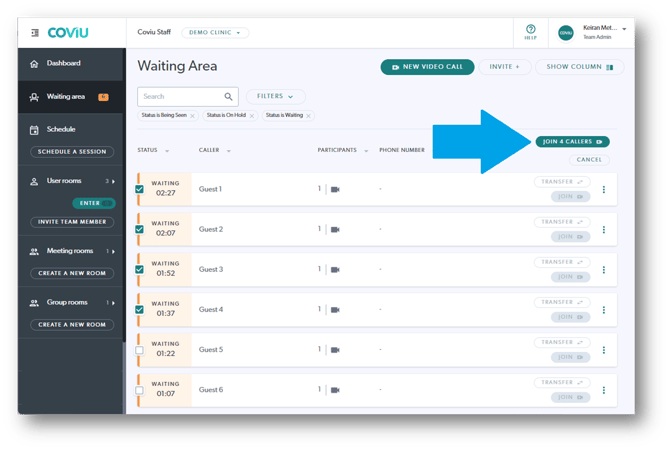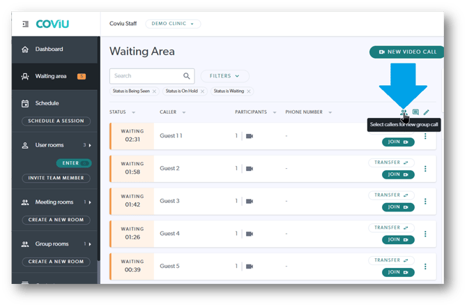 - Click on the Group Call icon at the top right of the Waiting Area and checkboxes will appear to the left of all Waiting callers.
