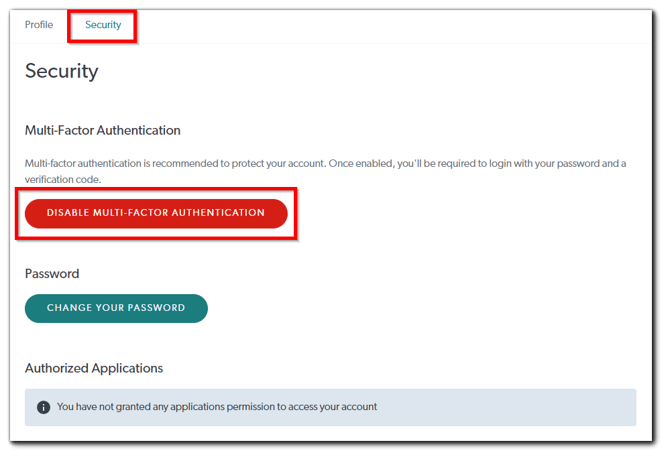- Click the Security tab and click Disable Multi-Factor Authentication.