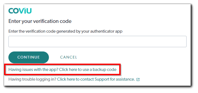 - If you are still unable to log in, click the Having issues with the app? Click here to use a backup code link and enter one of the ten Backup recovery codes that you have saved securely when you enabled multi-factor authentication for your Coviu account (see here). Click Continue to proceed.