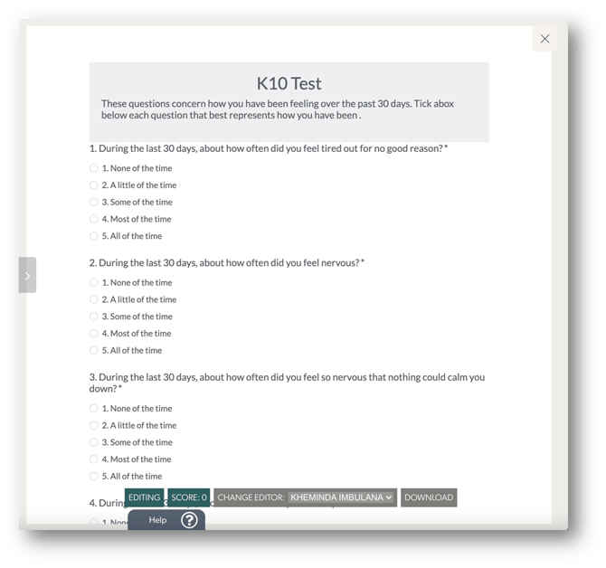 The K10 has been designed to work as a simple digital form to make it quick and easy for clients or patients to self-administer the questionnaire. Responses are scored and interpreted in real time.