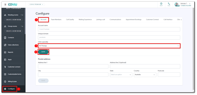 Note: You must be a Coviu account Owner or Administrator to select and save your clinic specialty.