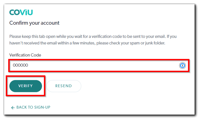 - You should receive a verification code to your email from no-reply@coviu.com shortly after submitting your application; enter this verification code in the Verification Code field and click Verify to finish creating your account.