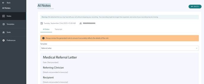 - To create another note from the same consultation, use the Template drop down menu to select another AI Note to be generated. You can generate as many notes as you’d like for a consultation.