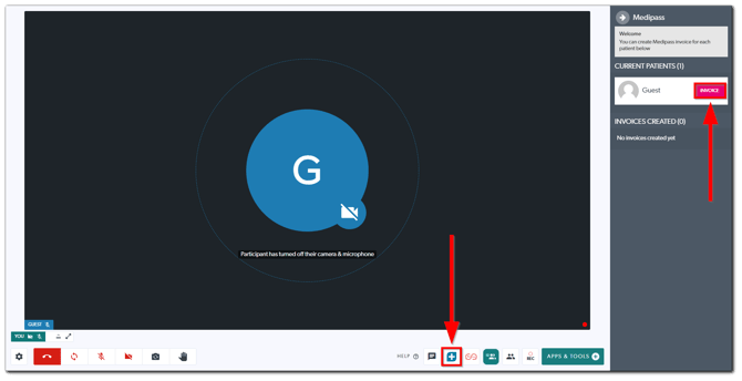 - On a video call with a client or patient, click on the Medipass logo on the bottom right of the screen. You will see the option to create an invoice for your client or patient.
