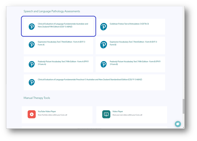 - The assessment will open in the shared resource section of your call (similar to when you are sharing your screen). See the CELF-5 example screen capture below or watch the video further below: