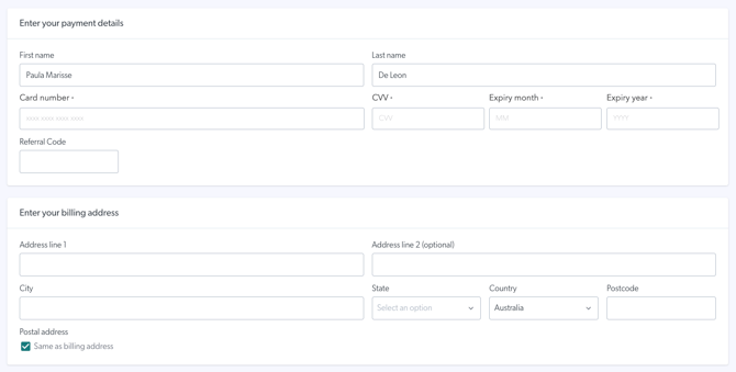 - Scroll down to update your payment details under Card number and Billing address. You can also enter a referral and/or discount code here.